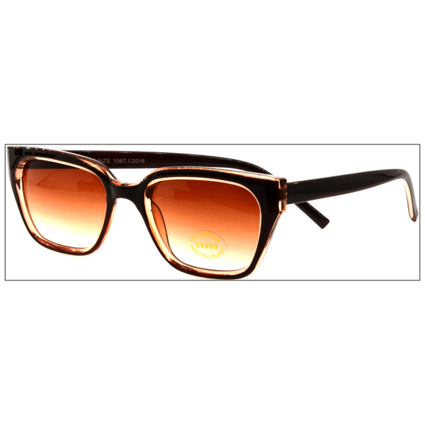 Clear with brown paint. Angled Trapezoidal shape with gradient brown lens